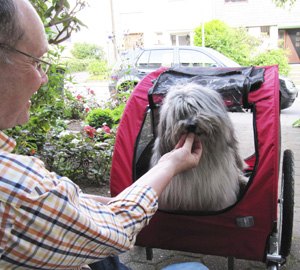 Hier seht ihr Mio grübeln. Ein Hund, ein Anhänger. Eins war mir sofort klar. Das hatte irgendetwas mit Rainers Fahrrad zu tun. Speichenräder erkenne ich auf den ersten Blick. Laufe ja schließlich oft genug daneben her.