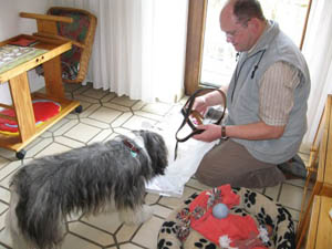 Was soll ich Euch sagen? Ein neues Geschirr, aus echtem Elchleder. Ganz weich und warm. Und riecht gut. Und oben hat es einen prima praktischen Griff, darüber freut sich Frauchen ganz besonders.