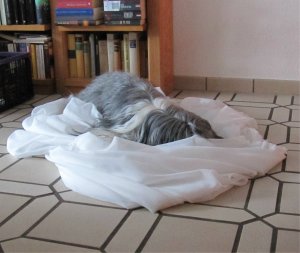Frauchen war es heute übrigens langweilig und sie hatte eine ganz spontane Idee! Sie hat die Gardinen abgenommen, um sie in die neue Waschmaschine (das war ein supertolles Paket!) zu stecken. Und als sie mit der ersten Wäschefuhre im Keller beschäftigt war, überkam mich mein Sinn für Gemütlichkeit. Ich habe mir die noch übrig gebliebene Gardine nett zusammengerafft und es mir darauf total gemütlich gemacht. Ich muss sagen, Gardinenstoff gibt ein komfortables Hundekörbchen mit einem exquisiten Touch ab. Ich hab richtig nett in meiner Premium-Villa geschlummert:
