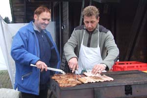 Die durften sich nach der Wanderung bei Grillfleisch und netten Getränken über die winterlichen Temperaturen hinweg trösten. Hier seht ihr Peter (rechts) und einen Freund am begehrten warmen Feuerplatz.