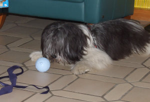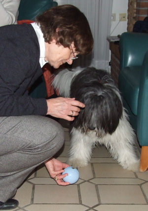 Frauchen nimmt die Kugel kurz in ihre Hände...