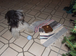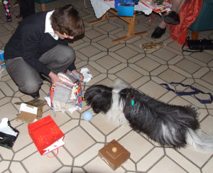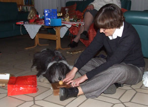 Weihnachten fing damit an, dass mein ganzes Rudel gemeinsam wunderschöne Weihnachtslieder heulte. Dann wurde der große Vorhang vor dem Weihnachtsbaum weggezogen. Am Weihnachtsbaum blinkten viele Kerzen und Kugeln. Das war schon ein prächtiger Anblick: Ein leuchtender Baum mitten in der Wohnung. Und das Beste: Darunter lagen Geschenke. Sophie machte sich gleich daran, ihre Geschenke auszupacken und ich setzte mich mal fix dazu. Bei so etwas regt sich in mir immer eine gewisse natürliche Neugierde: