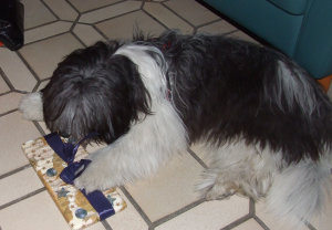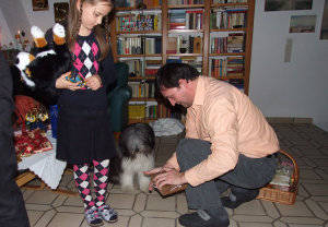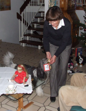 Frauchen hatte mit mir vor Weihnachten ganz heimlich das Schenken geübt. Und so machten wir uns Heiligabend auf eine kleine Rudelrunde und ich überreichte allen eine Tüte mit Leckerlis.