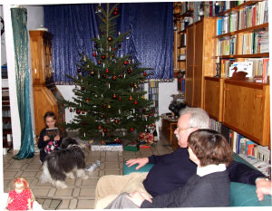 Es fing damit an, dass Frauchen und Herrchen das Haus für Weihnachten und vor allem für den Besuch von meiner Mini-Chefin mit ihren Eltern aus Augsburg vorbereiteten. Ich wurde ganz hibbelig von all den Veränderungen und lief aufgeregt durch alle Zimmer. Frauchen sagte: Kleiner Mio, bevor du uns vor Weihnachten einen Herzkasper bekommst, darfst du noch einmal bei deinem Freund Rainer übernachten. So etwas lasse ich mir nicht zweimal sagen: Fix die Sachen zusammengepackt, ab mit Frauchen ins Auto und zu meinem Freund. Dort machten wir uns einen total gemütlichen Vor-Weihnachtsabend: